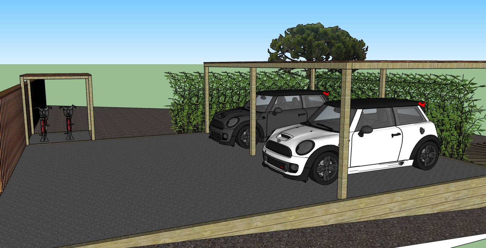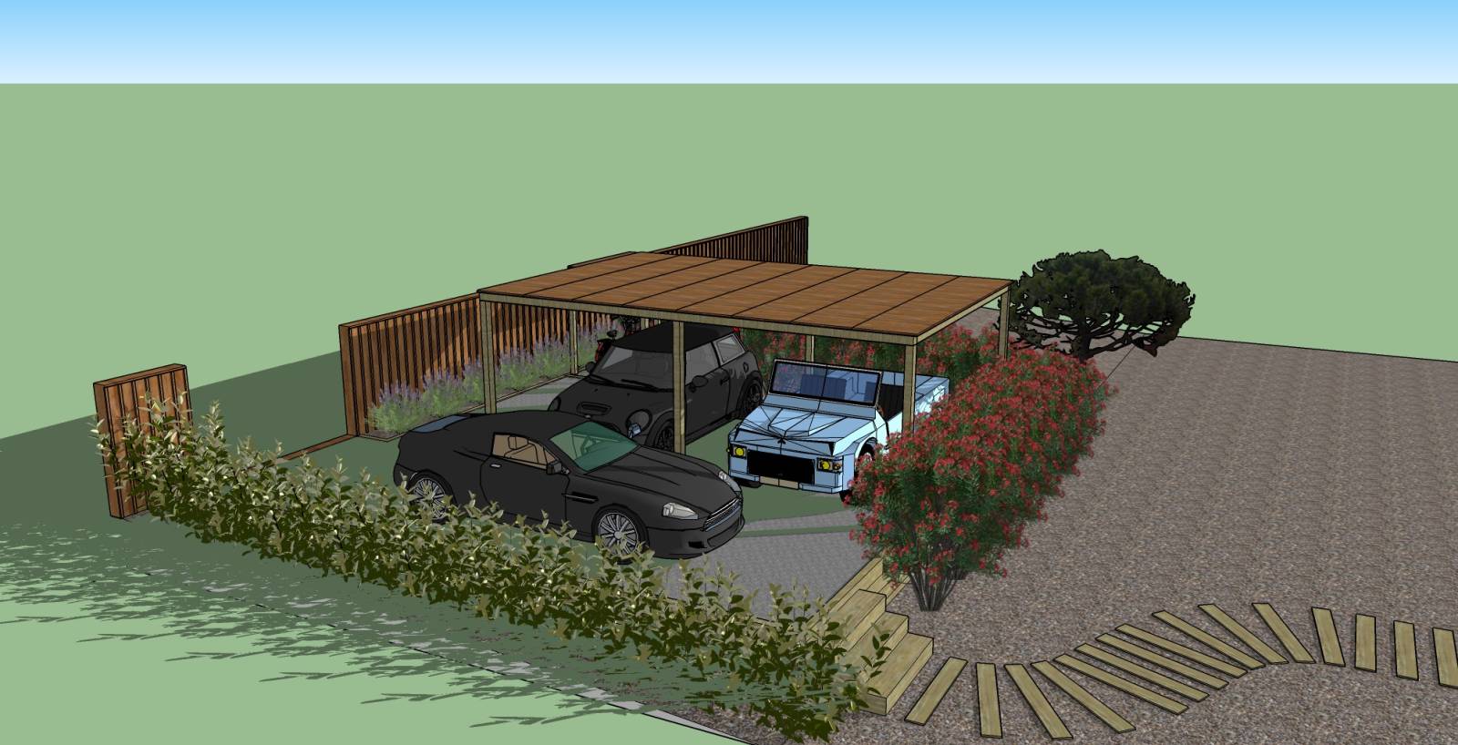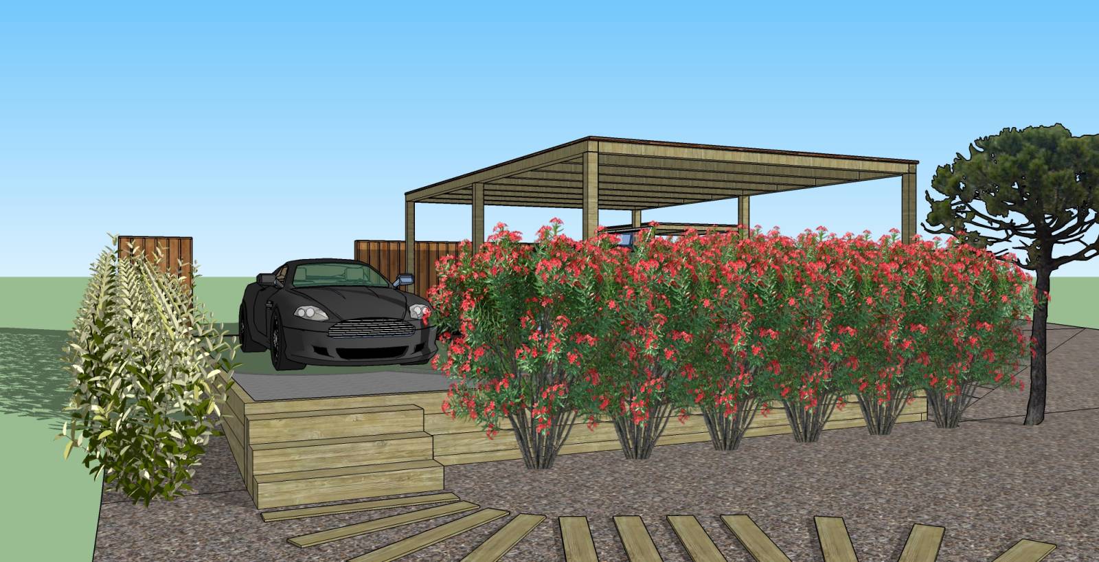 Grâce au plan 3D vous pourrez visualiser l'implantation d'un abri de voiture, une cabane de jardin, un abri en bois ou autre dans votre environnement actuel.